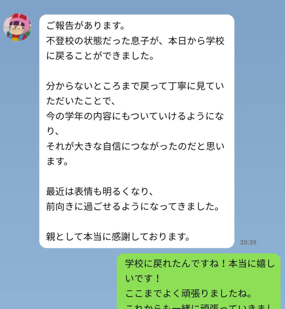 学校に行けていない期間があっても、今のお子さまの状況に合わせて無理のないところから進めていきます。